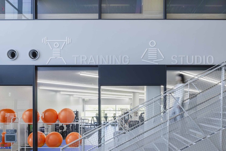 这套标识的形态更是核心亮点,处处可见 “橡胶纤维” 与 “编织” 意象的渗透。无论是代表力量训练的举重人形符号,还是柔剑道场中融合武道服、护具特征的象形图案,亦或是 studio 区域带有动态感的人物线条,都以简洁几何线条构成,却暗含纺织 “织纹” 的韵律 —— 线条的排列、交错如同纤维的编织过程,将地域产业的历史痕迹与运动项目的形态特征巧妙糅合,既实现了导视符号的易识别性,又赋予其独特的文化符号质感,让每一个标识都成为 “培育・编织” 理念的视觉缩影。