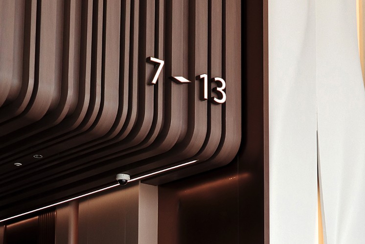 楼层标识在灯光映衬下清晰醒目,与空间中弧形木纹装饰形成呼应,既实现了功能导视,又成为大厅艺术细节的一部分,让来者在踏入办公区域的第一刻,便感受到空间的雅致格调。
