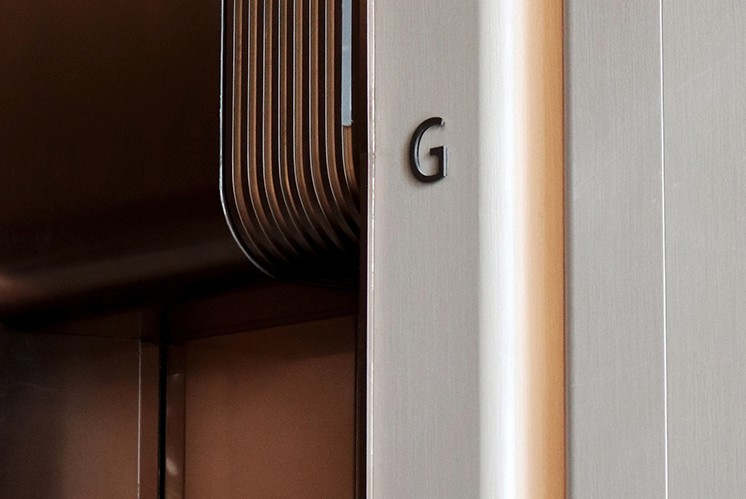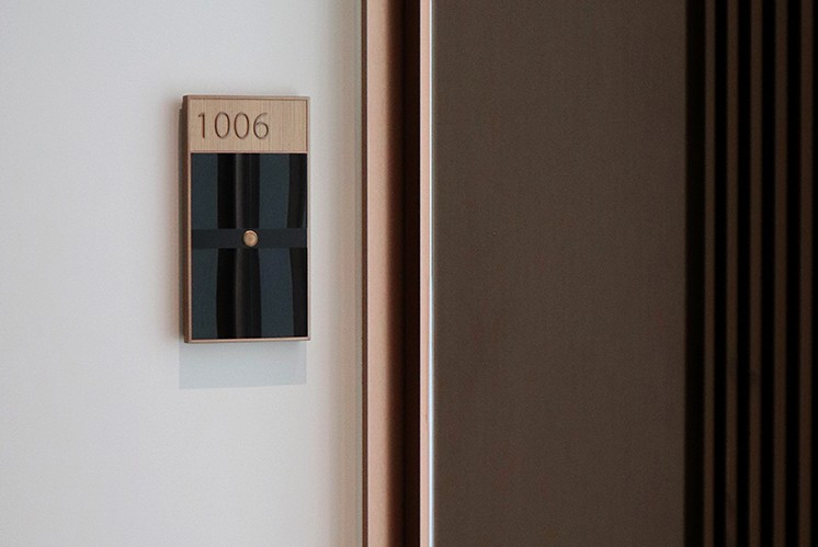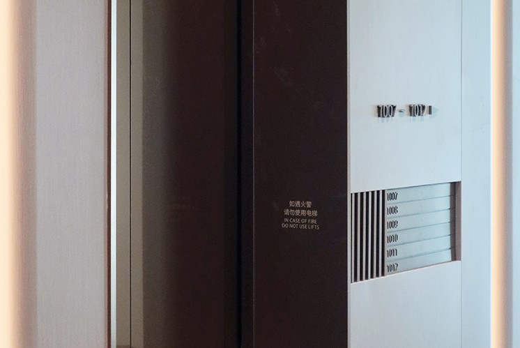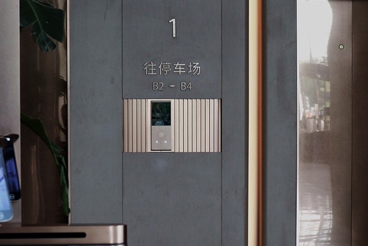 电梯厅的门户导视牌以简洁的排版、清晰的字体,快速传递信息,在浅色材质与灯光的配合下,既不喧宾夺主,又能在需要时快速被识别。