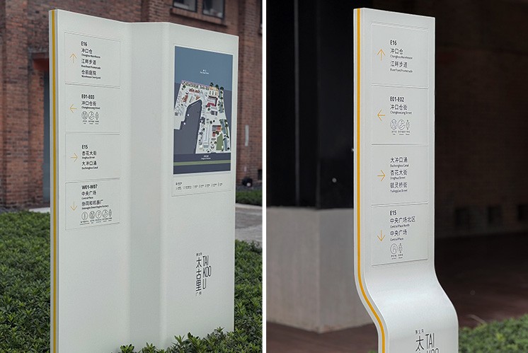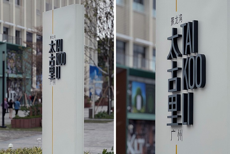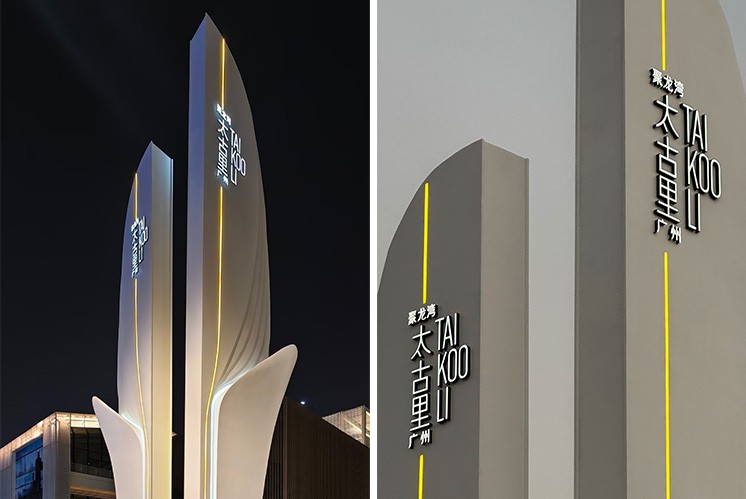 广州聚龙湾太古里的标识系统,是商业空间导视中,功能与美学共生的典型样本。精神堡垒的白色造型如舒展的叶片,在白天日光、傍晚暮色里,都能呈现出温润不冷硬的质感。
