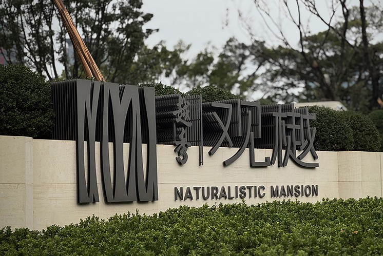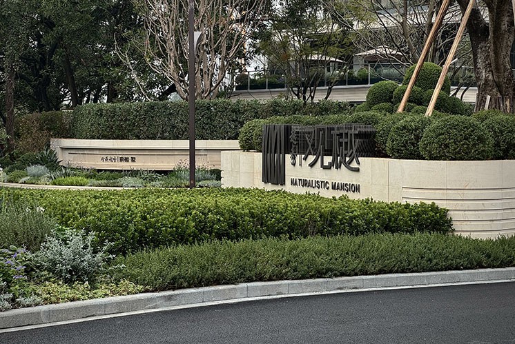 步入主入口,立体字反射银光,宛若月光轻抚石面。石质背景的“做旧”并非陈旧,而是一种被时间抚摸过的温润质感,与墅区“自然生长”的理念悄然呼应。
