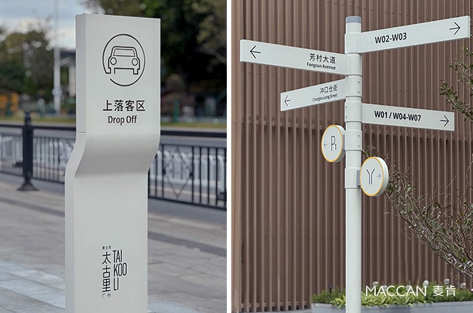 广州聚龙湾太古里的标识系统,是商业空间导视中,功能与美学共生的典型样本。精神堡垒的白色造型如舒展的叶片,在白天日光、傍晚暮色里,都能呈现出温润不冷硬的质感。其主视觉以 “哑光白色” 为基底,略带细腻肌理的柔和色调,材质选用耐脏且质感温润的金属烤漆,既适配商业空间的轻奢定位,又能与周边建筑的浅棕金属格栅、玻璃幕墙形成柔和呼应。