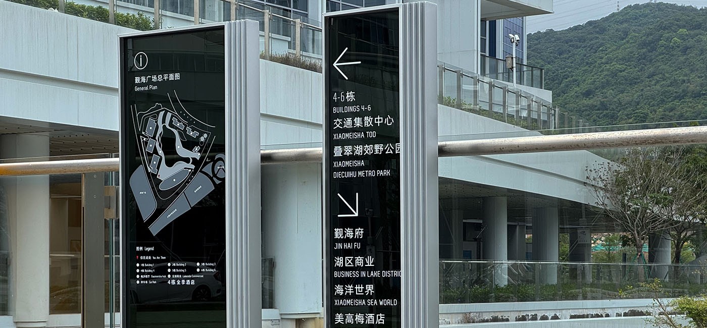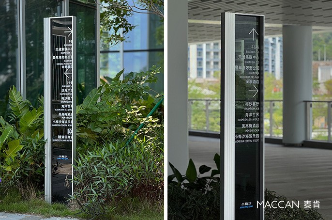 在深圳小梅沙的滨海热土上,觐海广场以 “办公 + 商业 + 生态” 的复合业态,成为该片区旅游放松、宜居办公的好去处。麦肯标识为项目量身打造的两套差异化导视系统,精准匹配办公与休闲两大功能区的空间属性,以设计语言赋能场景体验。
