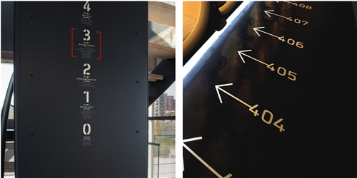 与公共空间导视系统不同的是,商业环境导视系统的利用空间都比较开阔,例如,商场、酒店与办公写字楼等。商业环境导视系统的设置更多安排在关键的指示区域,在大厅的主入口处、主要入口和通道、建筑物主体的入口正上方、室外扶梯客梯、中庭的边缘位置、橱窗与玻璃门、楼层的各个主次出入口等。