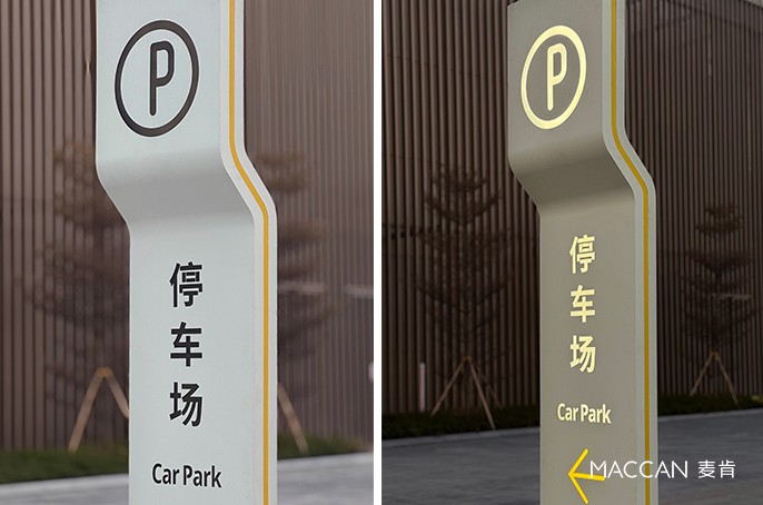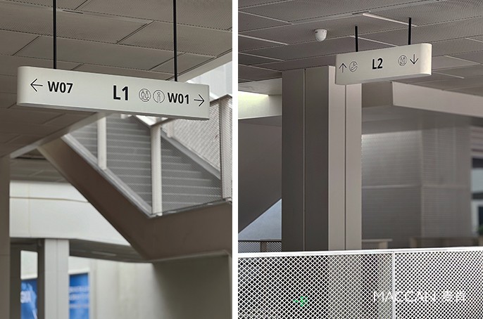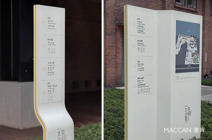 无论是流线型双塔精神堡垒,还是广场上的导视立牌,纯净的白色都不会被建筑线条淹没,反而以轻量感跳出背景,成为空间里的视觉锚点。这套由麦肯标识打造的系统,让导视不再是空间附加物,而是与项目工业遗存、滨水特质融合的美学部分,以轻盈有序的形象,打造这一商圈的年轻气质。